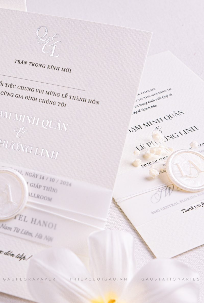 Sự kết hợp giữa sắc trắng ngà và chi tiết ép kim ánh vàng khiến Lustre Promise tỏa sáng một cách tinh tế. Thiệp không chỉ là lời mời mà còn là lời hứa về một hành trình trọn vẹn – thanh lịch, đẳng cấp và đầy ý nghĩa.