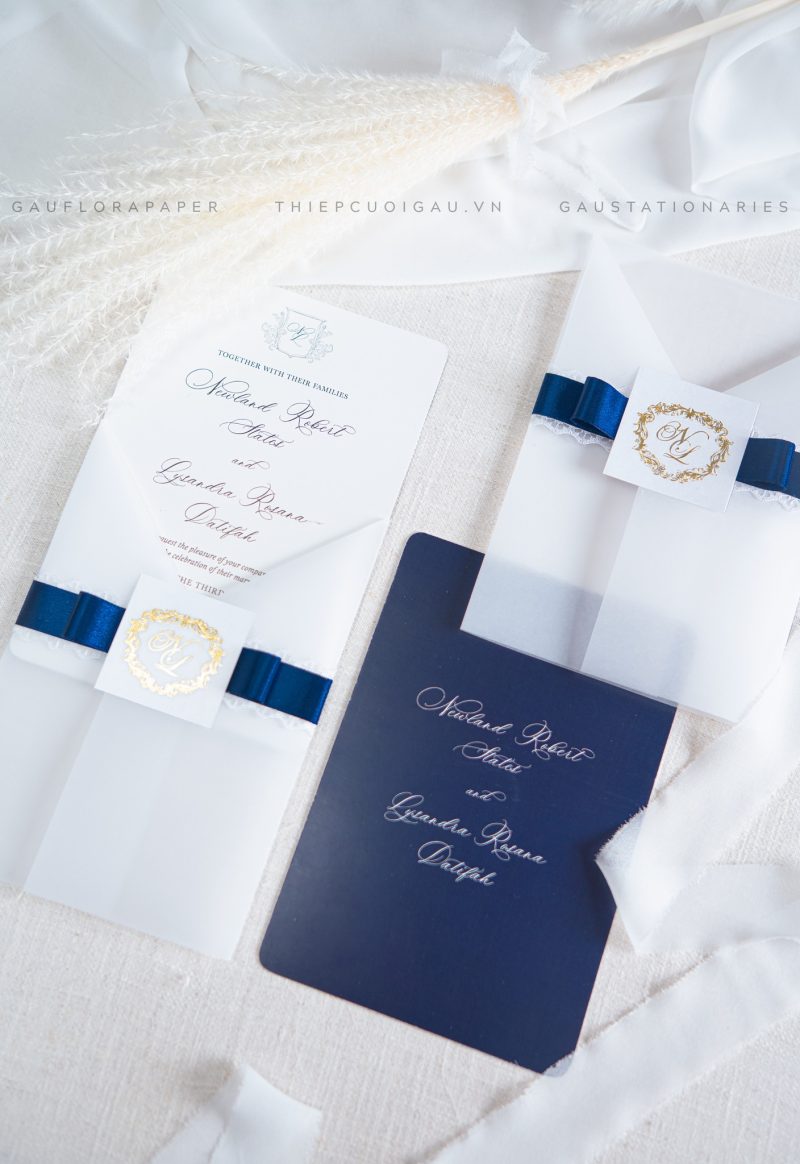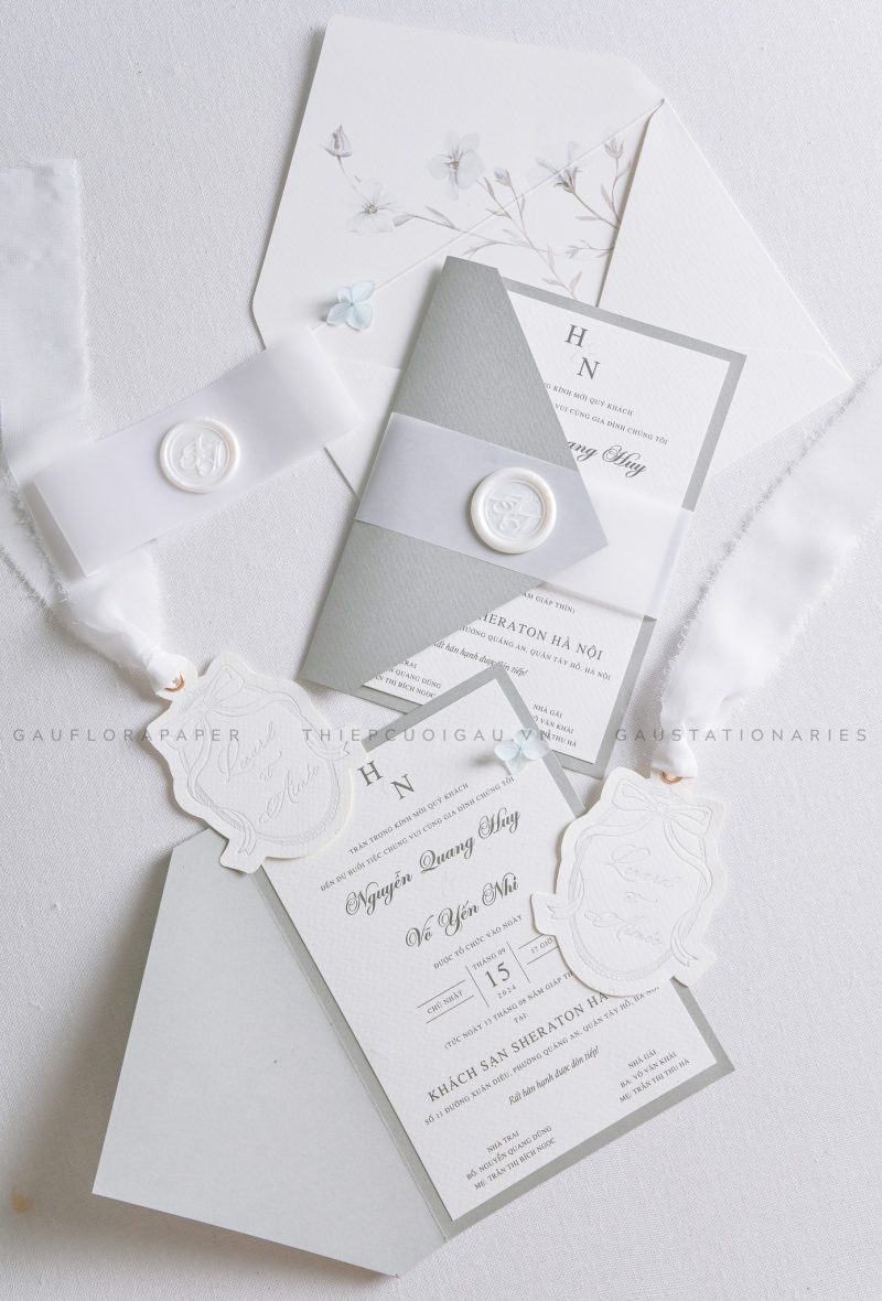 Một bản hòa tấu giữa sắc xanh và trắng tinh khôi, điểm nhấn là con dấu sáp và dây ruy băng thanh mảnh. Mẫu thiệp mang hơi hướng cổ điển, nhẹ nhàng mà vẫn đầy sức hút, như chính sự khởi đầu bình yên của một hành trình yêu.