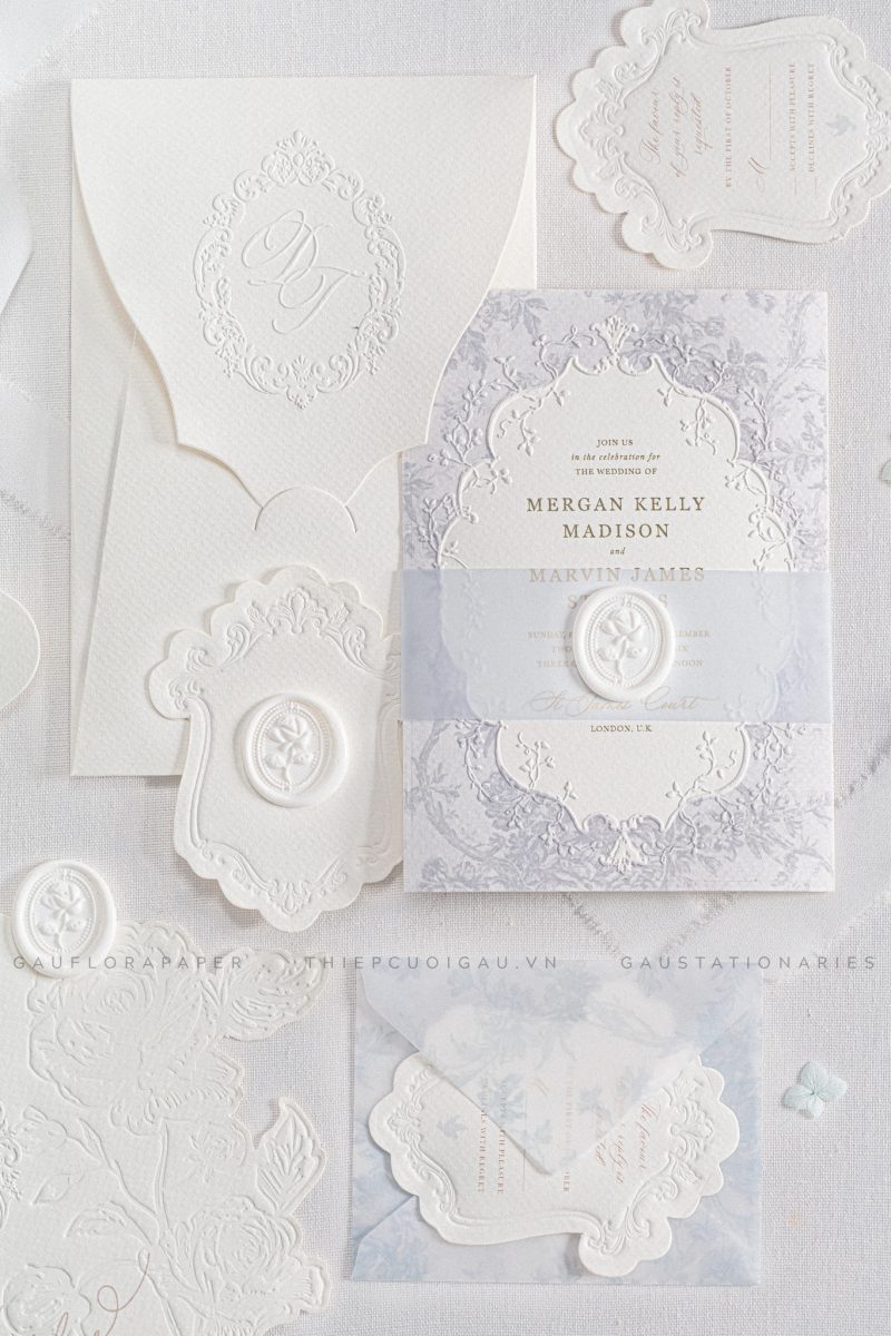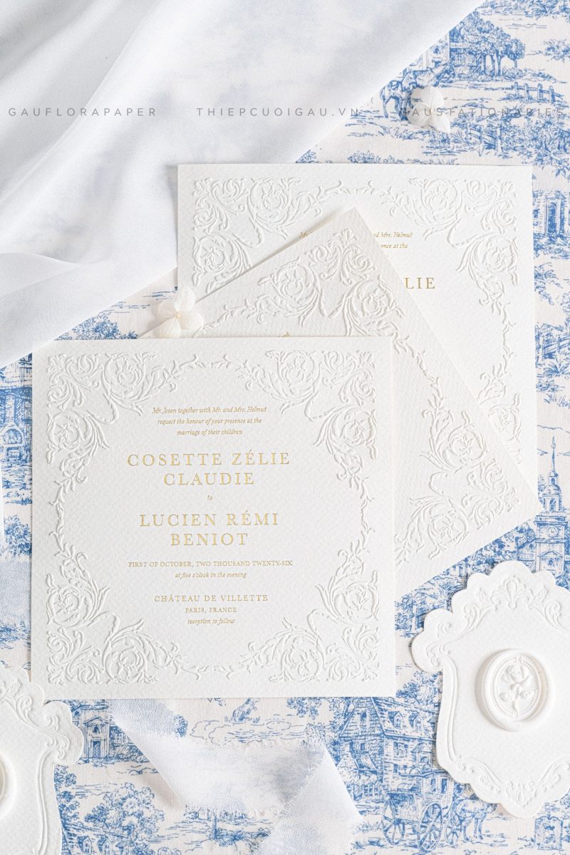 Lấy cảm hứng từ kiến trúc Pháp, Château Écru được ép nổi hoa văn tinh xảo trên nền giấy dày cao cấp. Thiệp mang hơi thở quý tộc, sang trọng – lựa chọn hoàn hảo cho những ai yêu thích sự cổ điển và thanh lịch.
