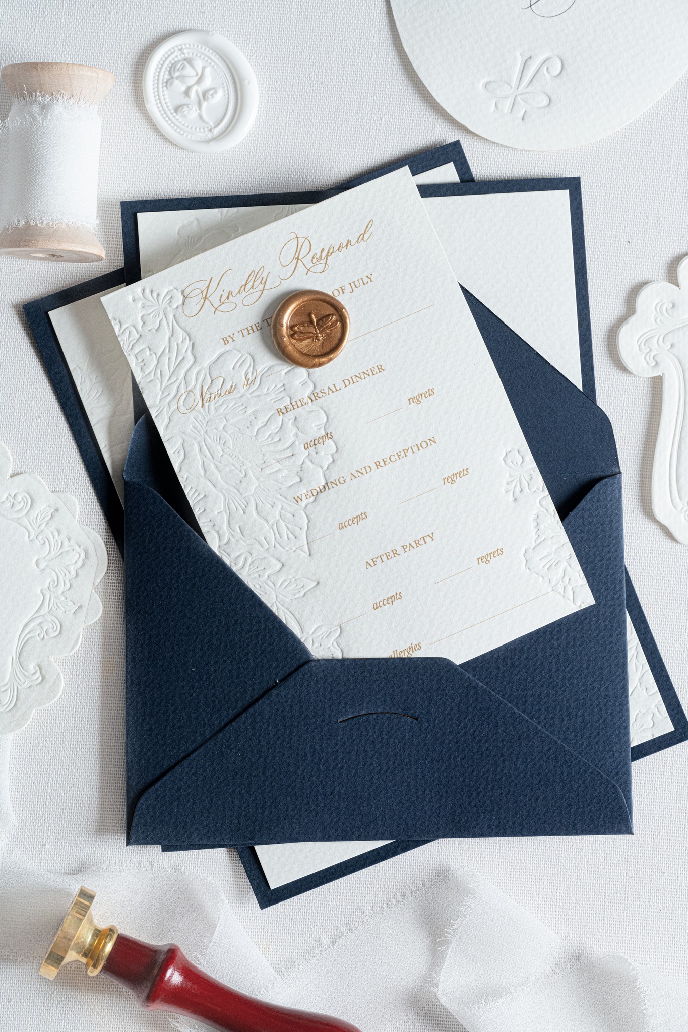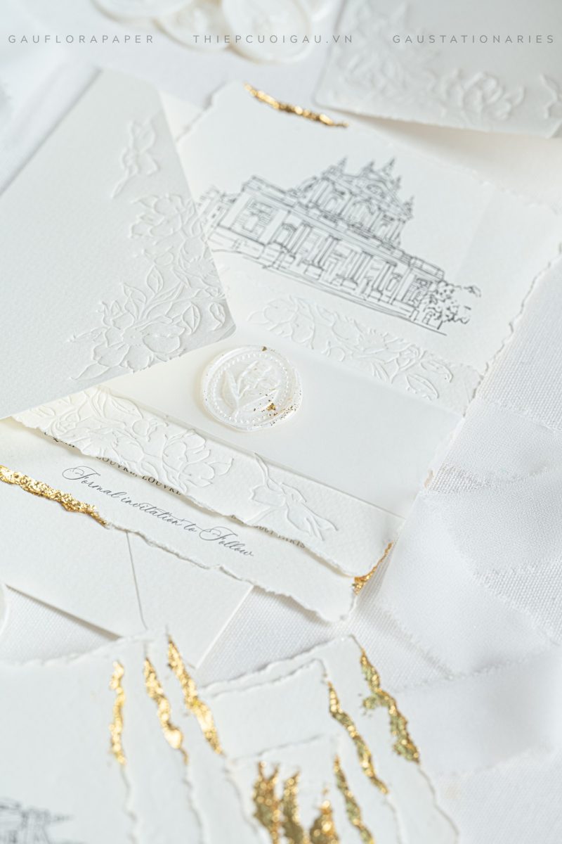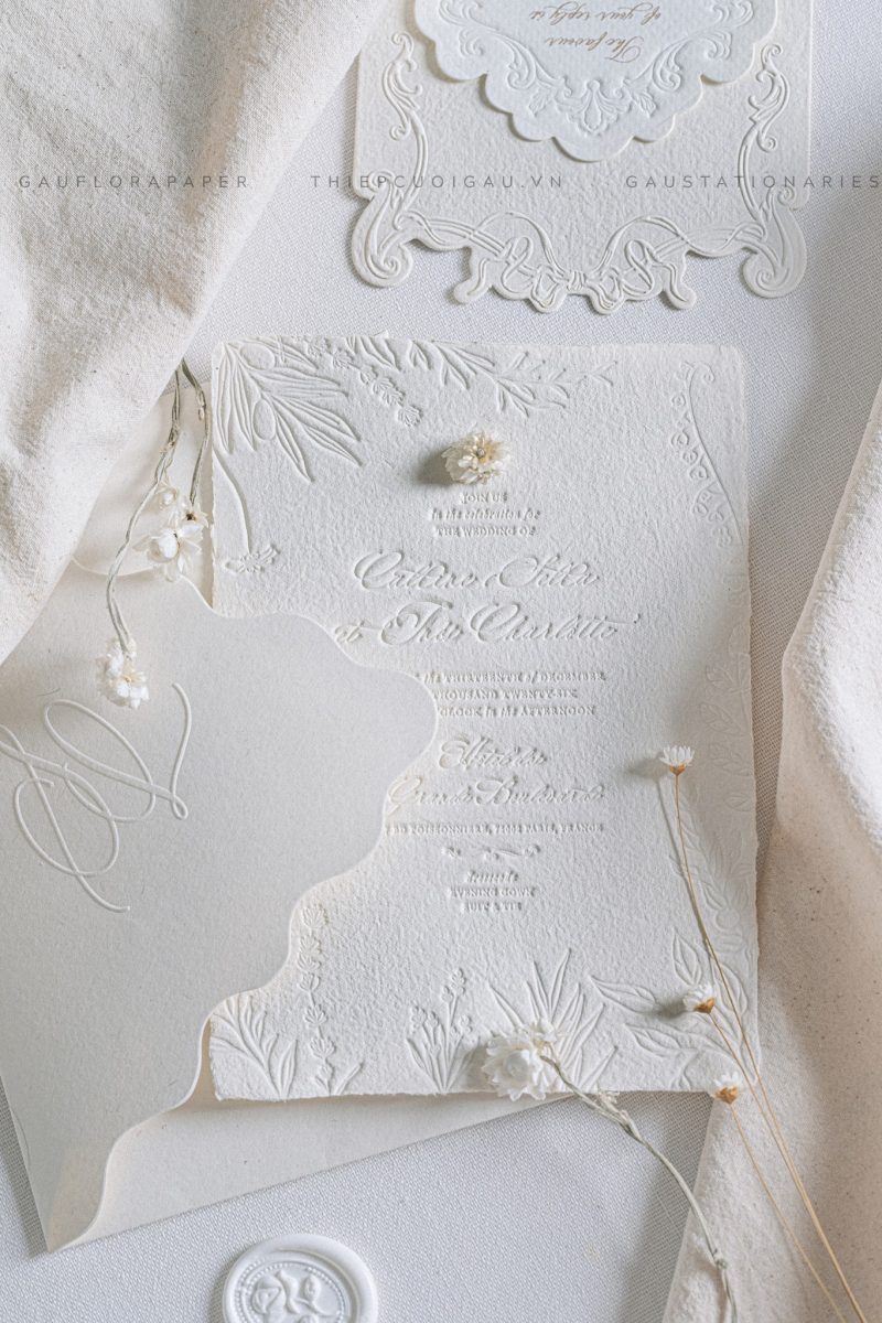 Mẫu thiệp này tinh tế đến từng đường nét. Giấy trắng phối cùng hoa văn dập nổi và con dấu sáp khiến tổng thể trở nên sang trọng mà không phô trương. Ethereal Muse được ví như “nàng thơ” của bộ sưu tập thiệp cưới Gấu.