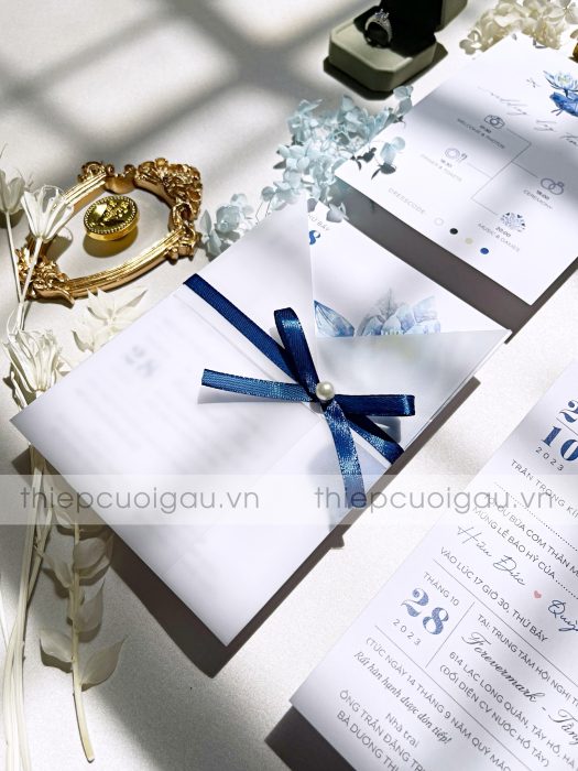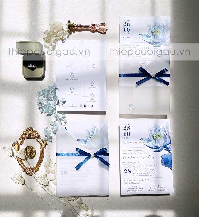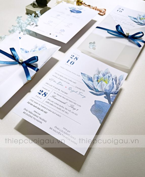 Tấm thiệp sử dụng tông trắng ngọc phối cùng họa tiết hoa sen watercolor xanh navy, tạo nên tổng thể nhẹ nhàng, sang trọng và tràn đầy cảm xúc. Điểm nhấn ruy băng lụa ánh xanh cùng hạt ngọc nhỏ nơi nút thắt như lời chúc phúc dịu dàng gửi tới cặp đôi trong ngày trọng đại.