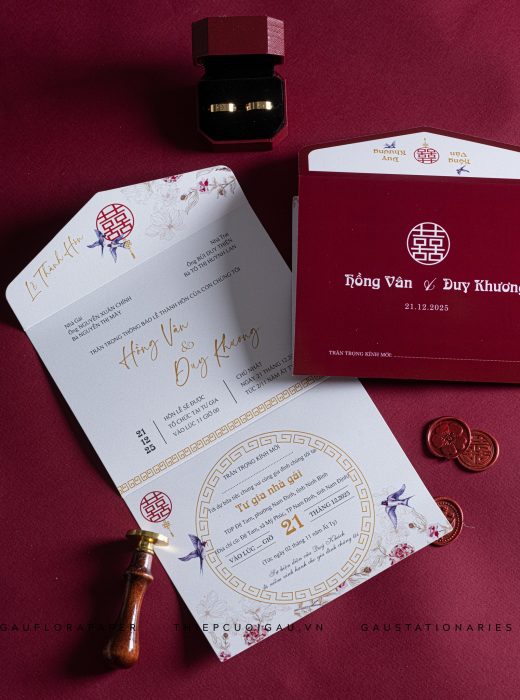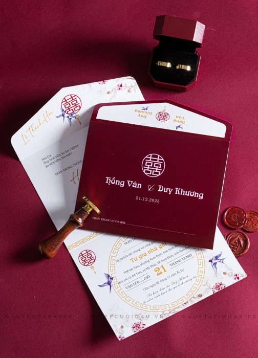 Thiết kế nổi bật với nền đỏ trầm ấm, tạo nên tổng thể vừa quyền quý vừa ấm áp – như lời chúc phúc tròn đầy cho một khởi đầu viên mãn.