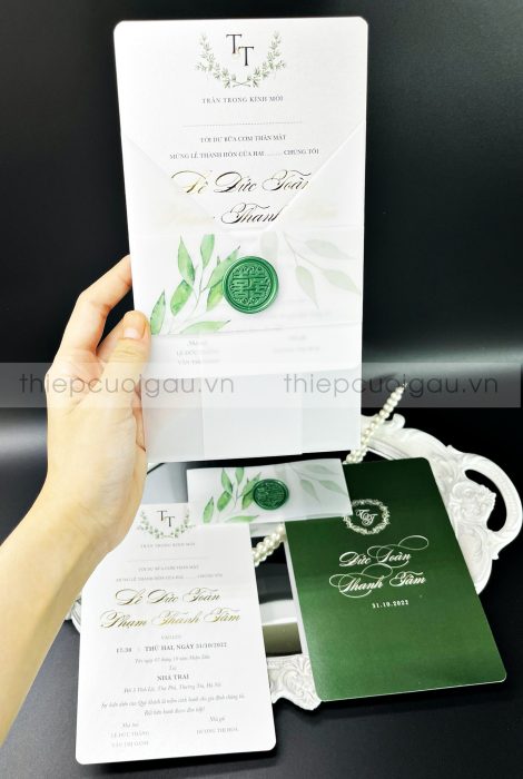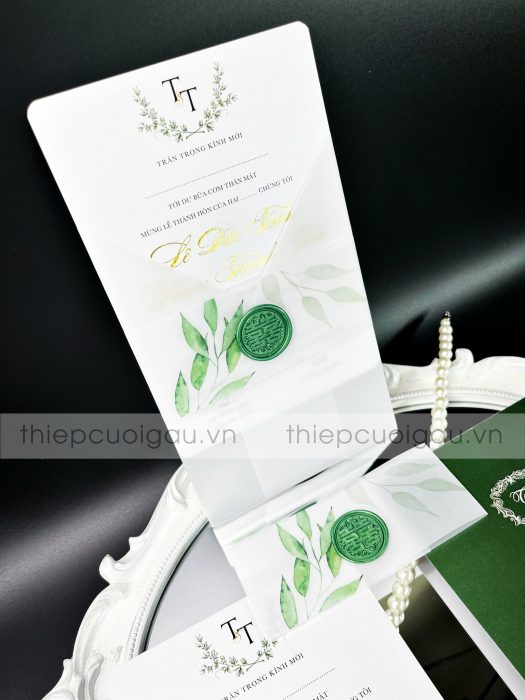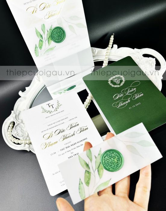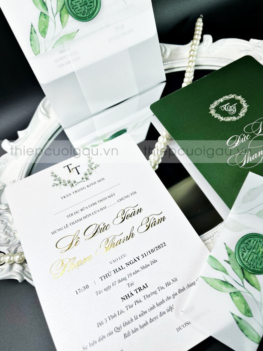 Mang hơi thở của sự tinh tế và cổ điển. Tông xanh lục đậm kết hợp chất liệu giấy nhũ ánh ngọc, chi tiết in foil vàng kim cùng tem sáp thủ công tạo nên điểm nhấn sang trọng, đậm chất châu Âu cổ điển.