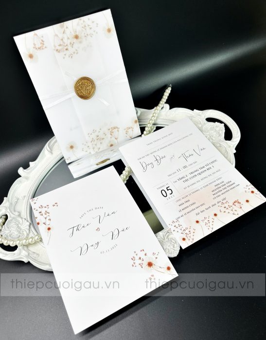 Golden Meadow là mẫu thiệp cưới hiện đại mang đến cảm giác mộc mạc mà tinh tế. Lấy cảm hứng từ những bông hoa khô đồng nội nhẹ nhàng trong nắng sớm. Thiệp được thiết kế trên nền trắng kem, điểm xuyết họa tiết hoa dại màu beige và cam đất, kết hợp cùng dây ruy băng trắng và sáp niêm vàng đồng  tạo nên tổng thể vừa cổ điển vừa thanh nhã.