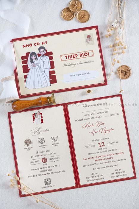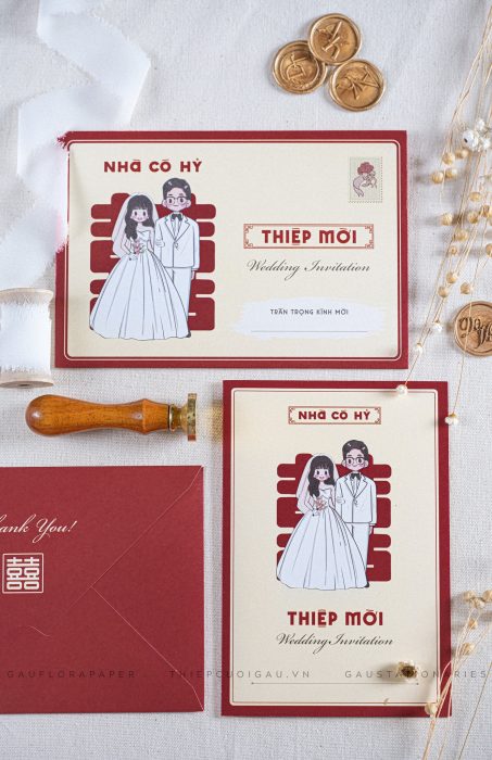 Thiệp cưới sử dụng 03 tone màu cơ bản của ngày cưới: Trắng – Đỏ – Hồng kết hợp cùng hình vẽ chibi dễ thương và trẻ trung. Thiệp Chibi được đính kèm phụ kiện là nơ đỏ giúp chiếc thiệp thêm độc đáo và ấn tượng.