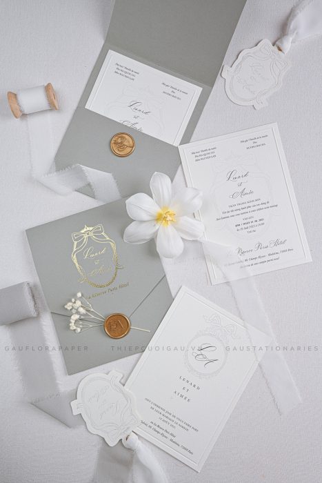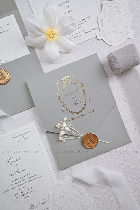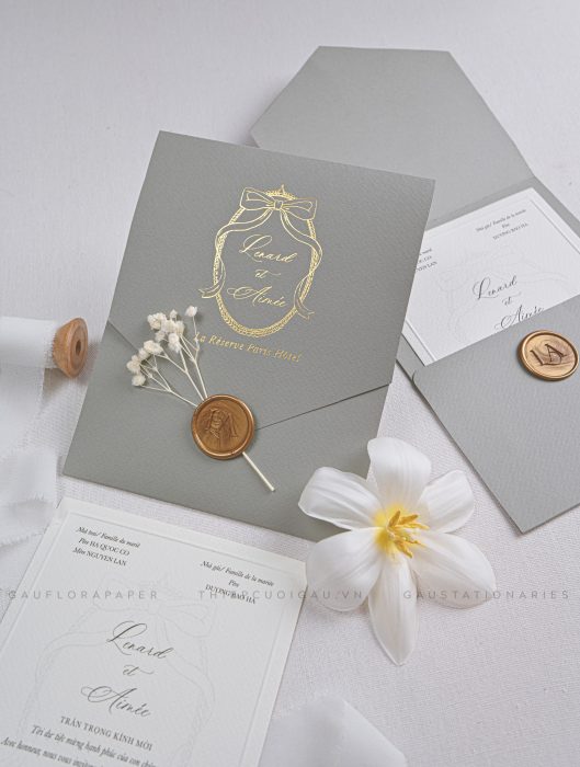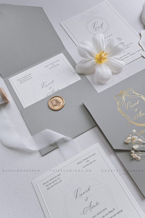 Gam màu xám trung tính hiện đại kết hợp cùng chữ ép kim ánh vàng tạo nên vẻ đẹp cân bằng – vừa ấm áp, vừa đẳng cấp.