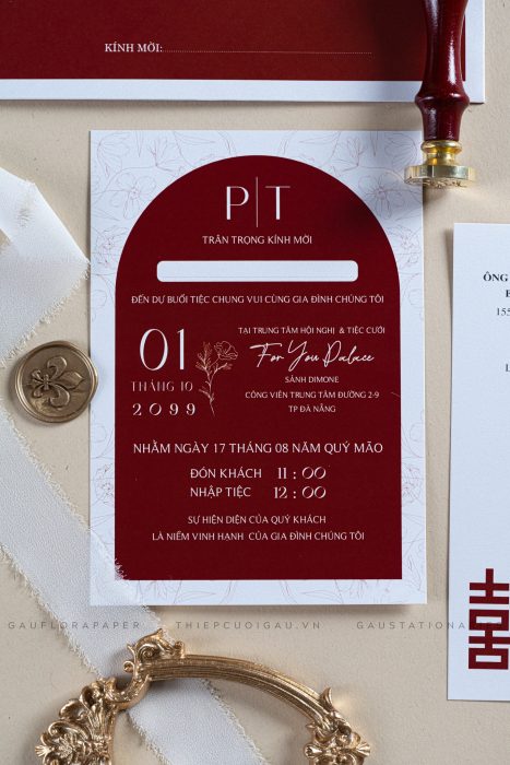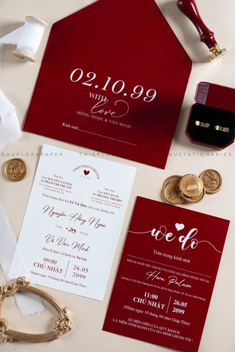 Những điều bình dị, xa xưa khiến con người ta bồi hồi, trân trọng luôn là một nguồn cảm hứng bất tận cho những hoạ sĩ của Gấu. Một sắc đỏ muôn đời vẫn tượng trưng cho tình yêu – nồng cháy, quyến rũ và có phần phiêu lưu. Một chút hoạ tiết, hoa văn pha vào sắc đỏ thêm chút lãng mạn, hiện đại. Sự kết hợp giữa màu sắc và đường nét trang trí tạo nên những chiếc thiệp cưới với phong cách Tân cổ điển luôn được nhiều đôi uyên ương ghé Thiệp cưới Gấu ưng ý lựa chọn.