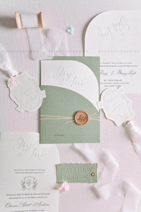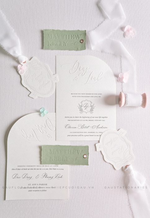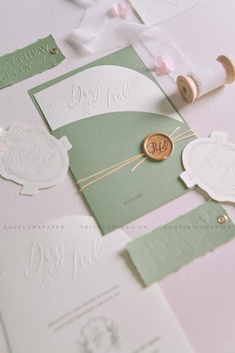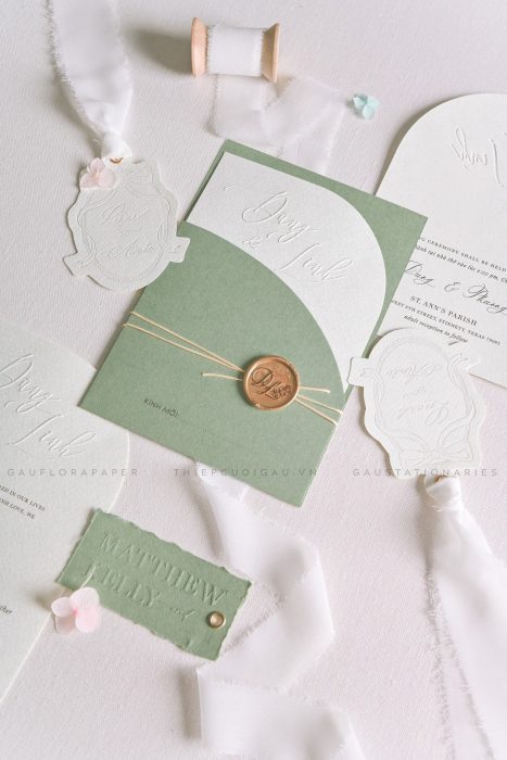 Mỗi chi tiết trên thiệp được chăm chút tỉ mỉ – từ chạm nổi tinh khôi, dấu sáp vàng đồng ánh ấm, đến đường cong lượn mềm mại ôm lấy thiết kế tối giản nhưng đầy cuốn hút.