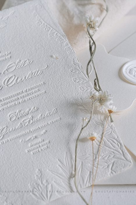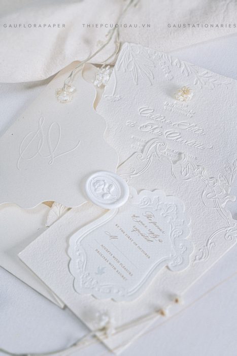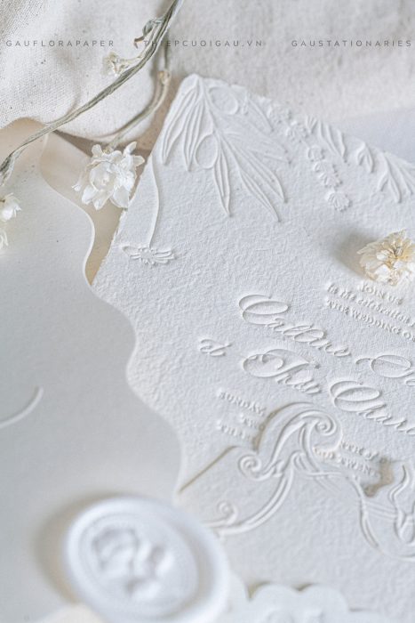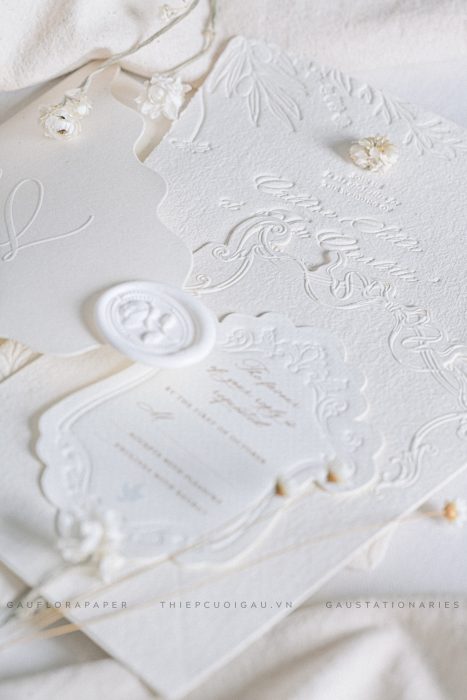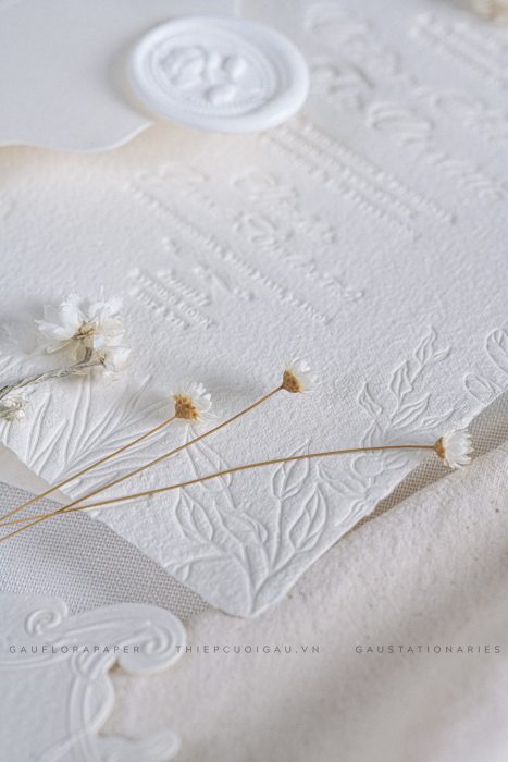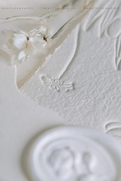 Ở giữa đó, dấu wax seal trắng tinh khôi đặt lên nền giấy thô xé tay giống như vệt sương sáng phủ lên cánh hoa trong bình minh,