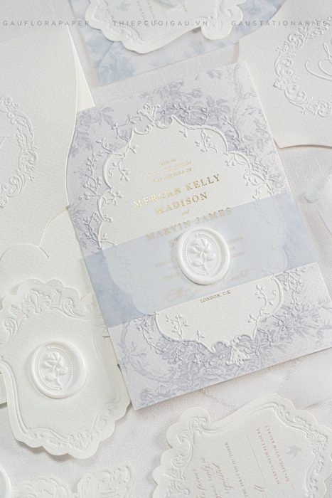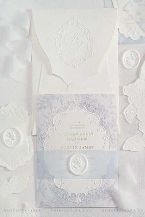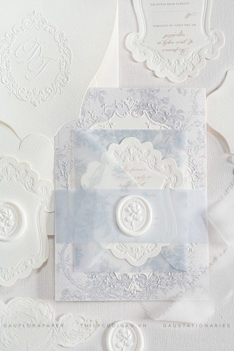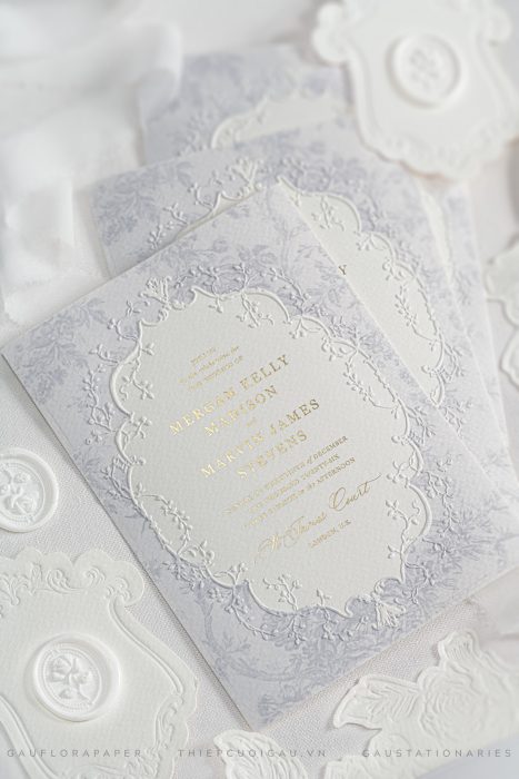 Trên nền giấy mỹ thuật dày mịn, từng đường dập nổi baroque hiện lên như những vệt thời gian mềm mại.