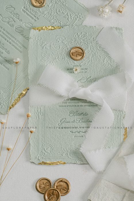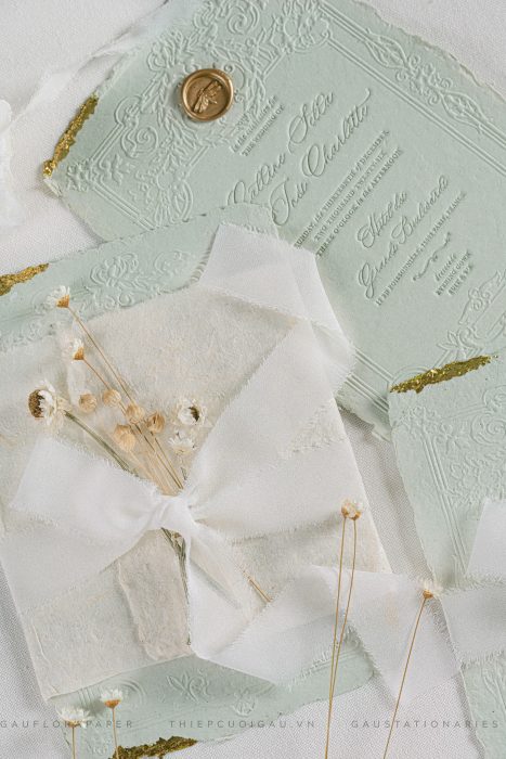 Lấy cảm hứng từ gam xanh sage pastel – màu của sự an yên và thuần khiết, bộ thiệp mang đến cảm giác dịu dàng nhưng vẫn toát lên nét cổ điển đầy cuốn hút.