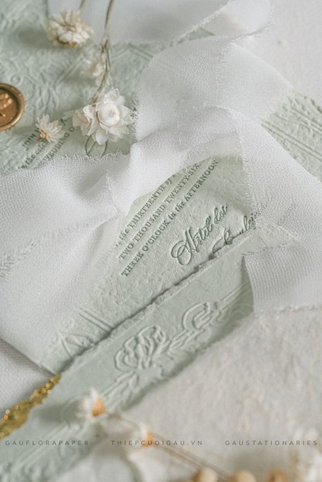 Từng tấm thiệp được hoàn thiện bằng kỹ thuật dập nổi tinh xảo trên nền giấy mỹ thuật thủ công. Mép giấy được xé viền tự nhiên, phủ ánh gold leaf nhẹ ở rìa – chi tiết tạo nên nét độc bản và nghệ thuật, như lời thì thầm nhỏ giữa thiên nhiên và tình yêu.