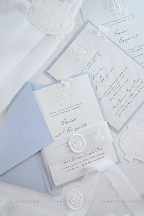 Mẫu thiệp cưới cao cấp tông xanh pastel nhã nhặn, thiết kế theo phong cách tối giản châu Âu.
