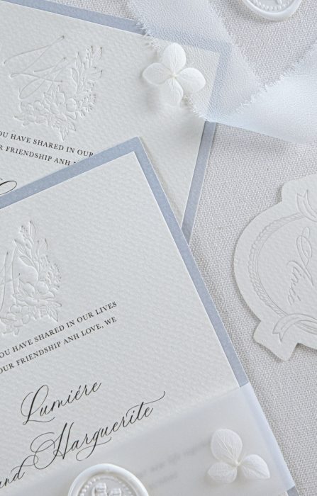 Chất liệu giấy mỹ thuật dày dặn, kết hợp chữ ép kim nổi và niêm sáp trắng tinh tế, mang đến cảm giác sang trọng và hiện đại.