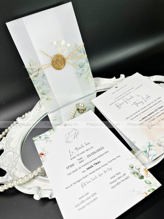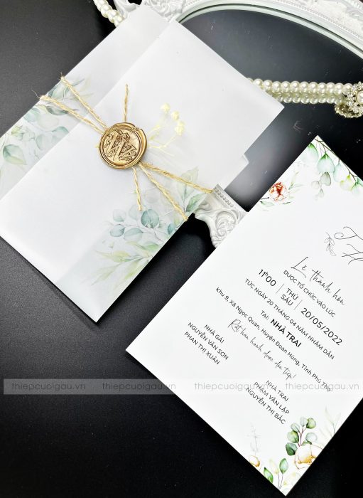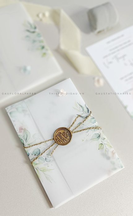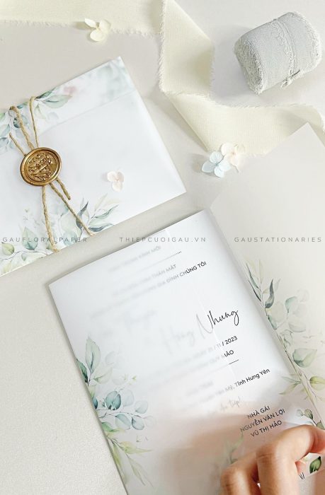 Sự hòa quyện giữa lớp giấy vellum trong suốt, sắc xanh lá watercolor dịu mắt và con dấu sáp vàng đồng thủ công tạo nên một bản giao hưởng tự nhiên, mềm mại mà vẫn đầy sang trọng.
